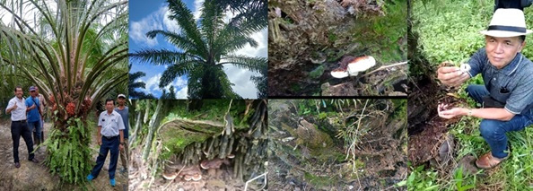 Serangan Ganoderma umumnya ditandai dengan daun yang menguning dari bagian bawah, pelepah mudah patah, dan jaringan pangkal batang yang membusuk berwarna cokelat tua. Kondisi tersebut ditemukan hampir di seluruh blok kebun yang telah berumur lebih dari 10 tahun. Menurut para ahli, penyebaran patogen ini semakin cepat akibat penggunaan bibit yang tidak tahan penyakit, sistem drainase yang buruk, serta penanaman ulang tanpa sanitasi lahan yang baik.